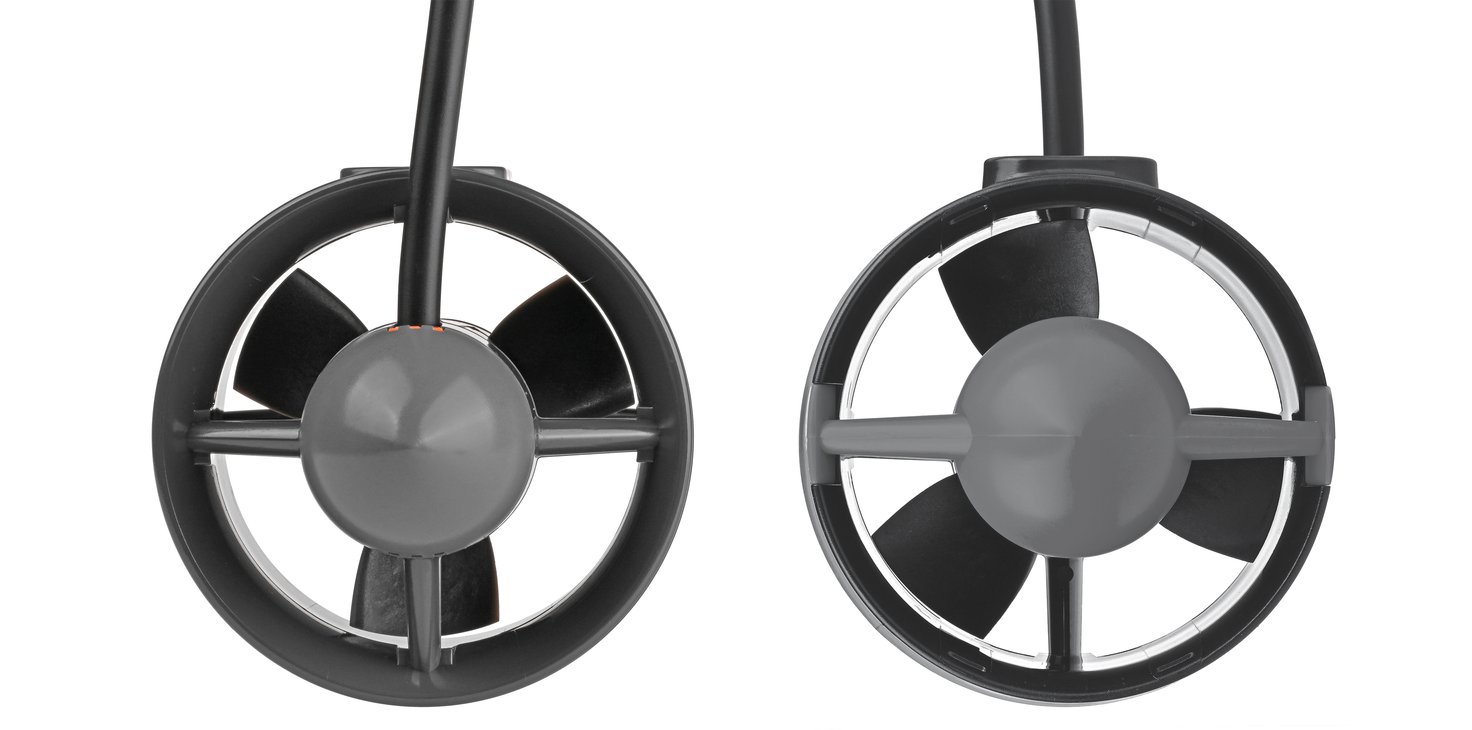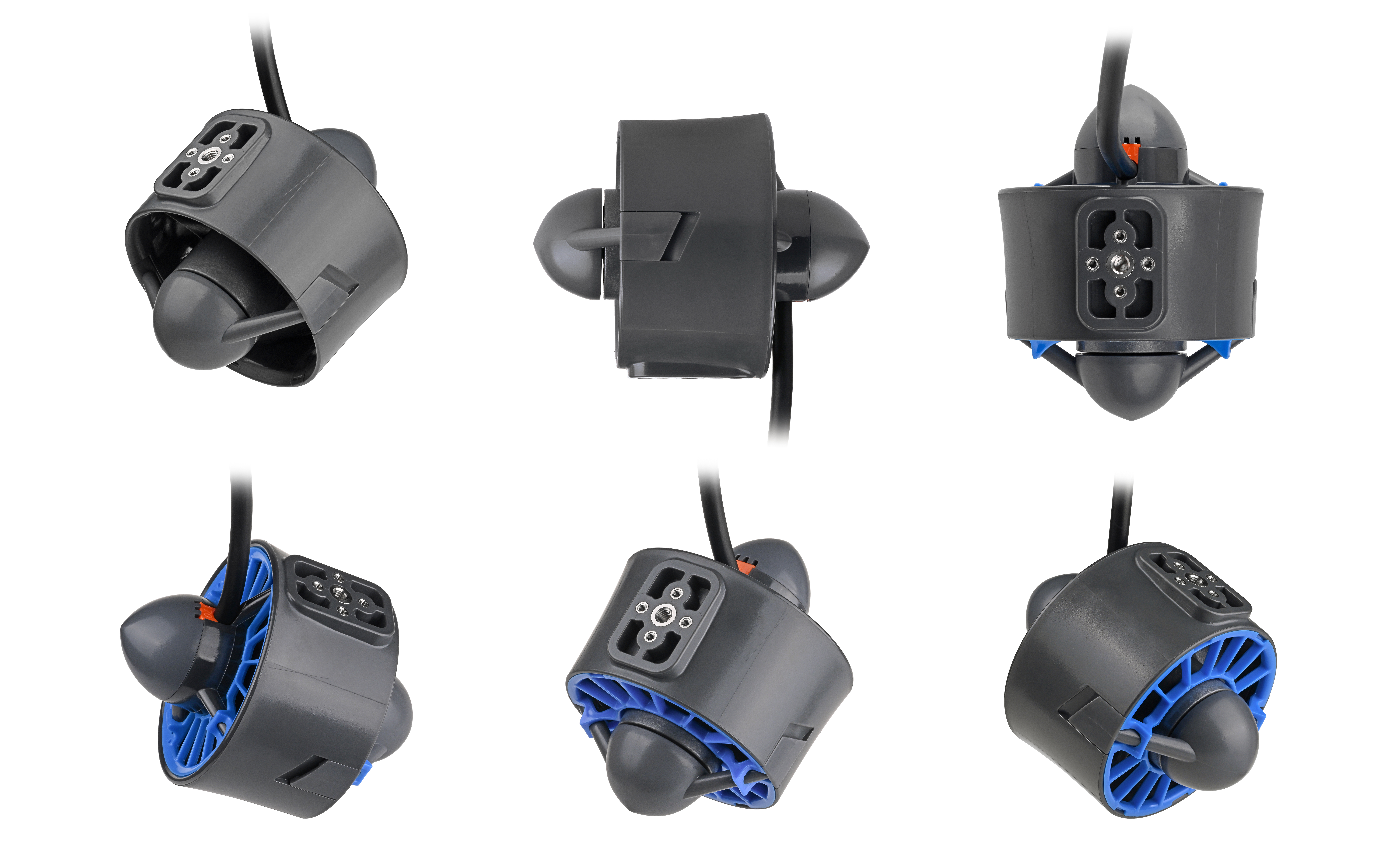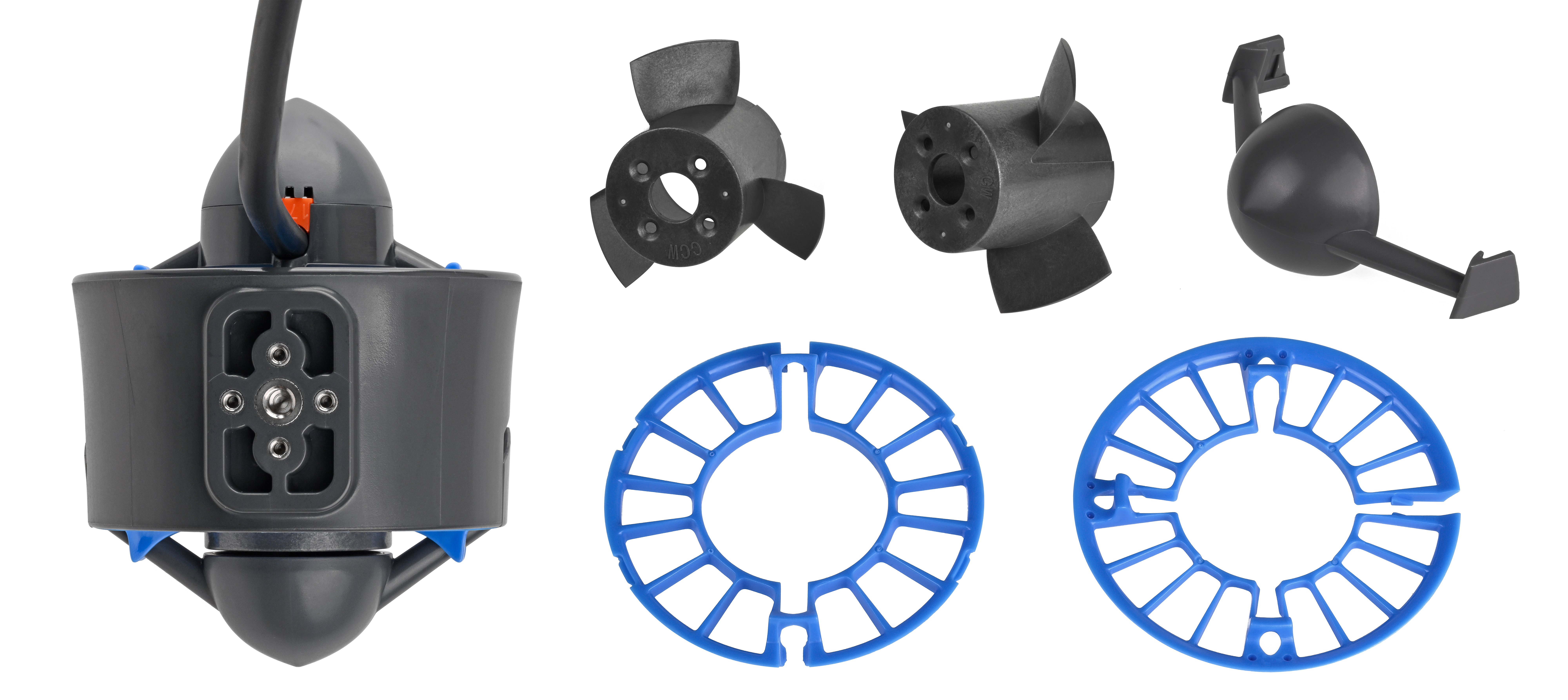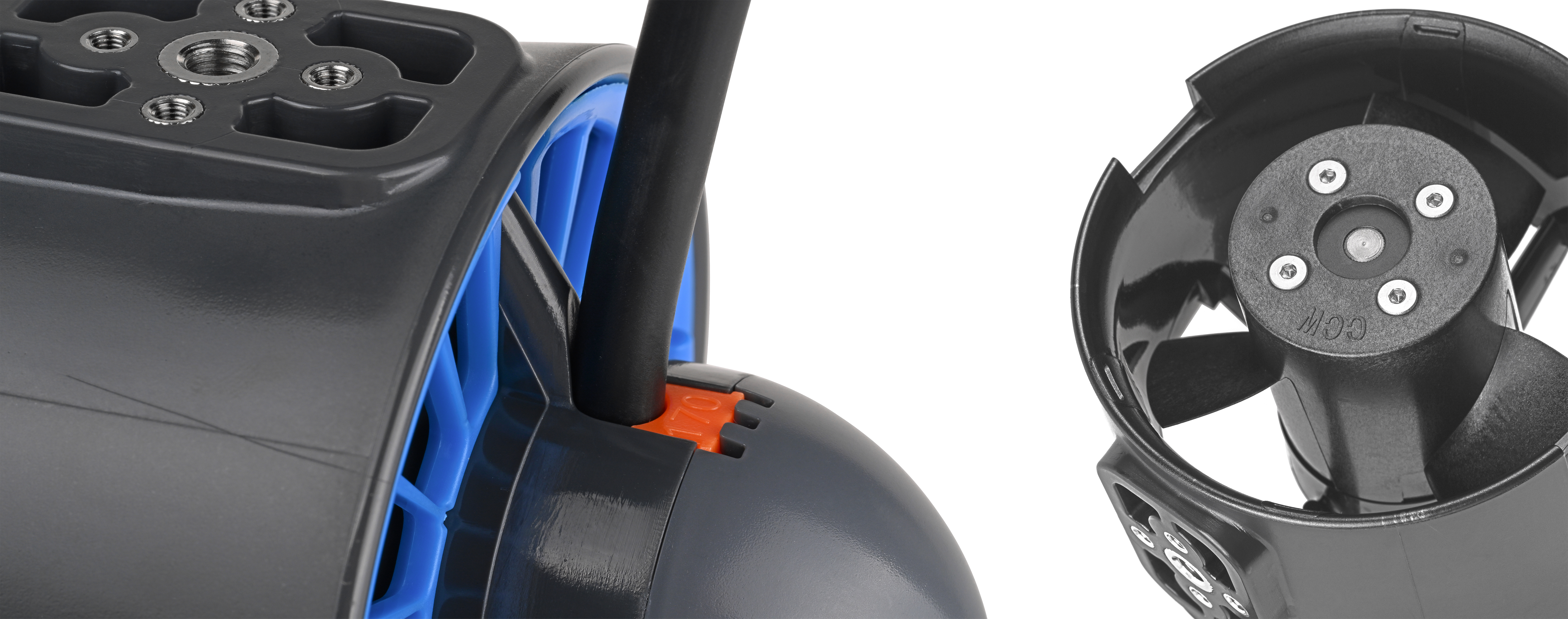 根据所选型号预装对应桨叶,另标配有反向桨叶,标配有阻拦水草等杂物的免工具拆装网罩,网罩符合 IP2 的手指阻挡防护等级。推进器超出 IP 防护标准等级,耐压能力达到水下 300 米深度。同样尾盖也可快速拆卸方便更换桨叶和清理异物。安装面除了涵道上的4个安装孔外,中心还有一个满足快速拆装的单安装孔。