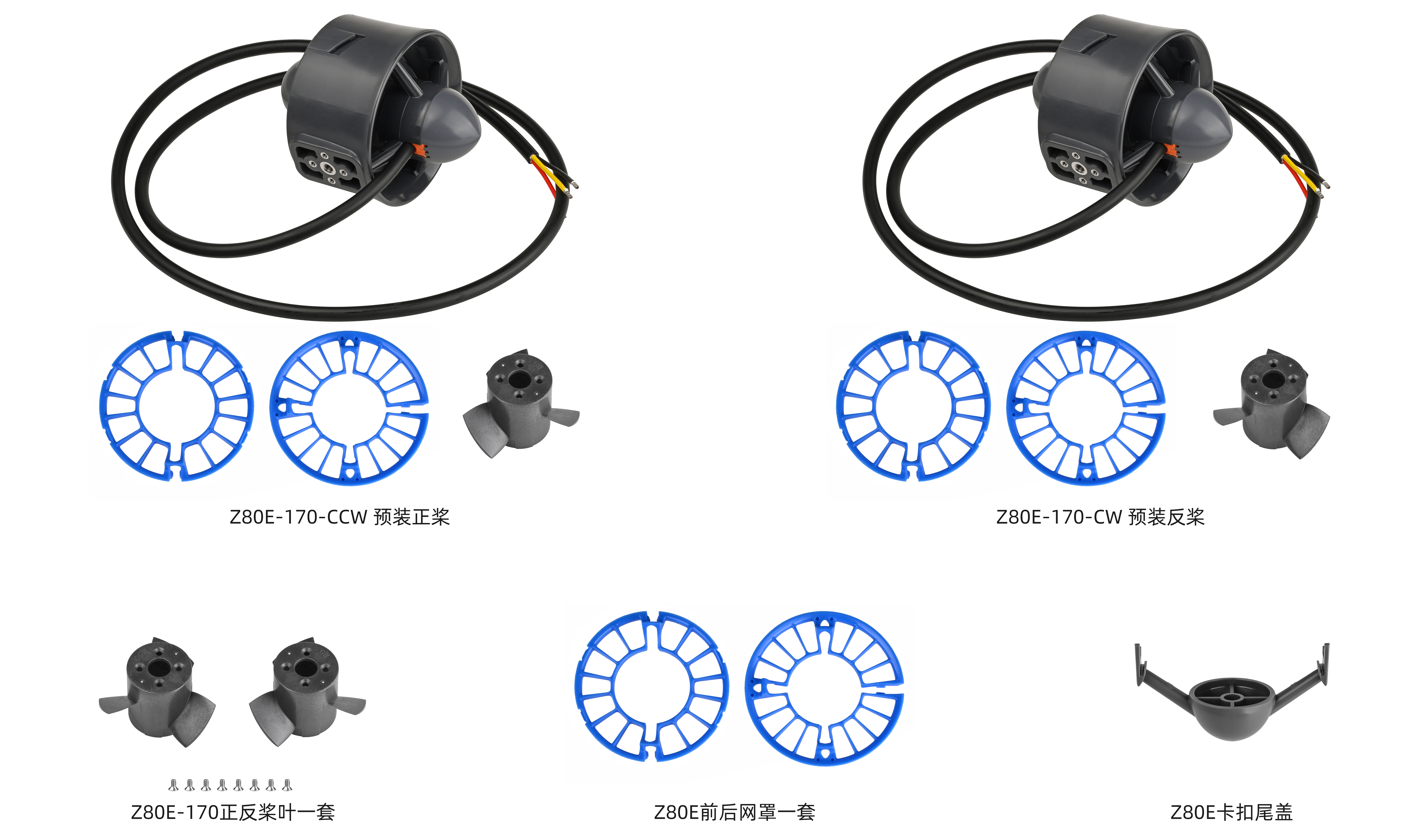 | Z80E-170-CW 预装反桨 | 170kv内置方波驱动(含CCW桨叶和网罩) | PC 灰色 | 10010605-0002 | 500g | 铭牌处“170”灰色外壳 |