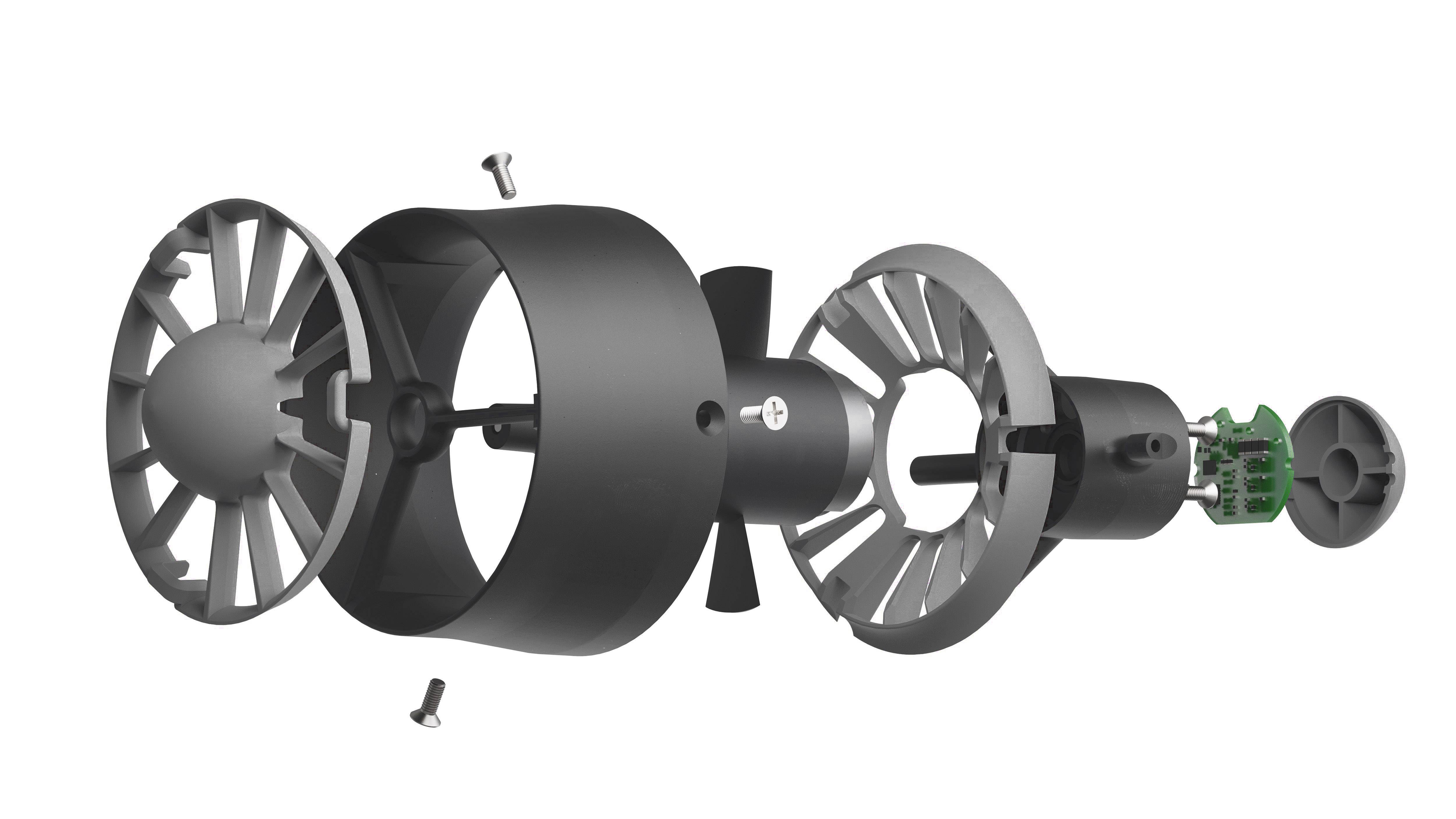 附有阻拦水草等杂物的网罩,网罩符合 IP2 的手指阻挡防护等级。推进器超出 IP 防护标准等级,耐压能力达到水下 300 米深度。同样涵道也可快速拆卸方便更换桨叶和清理异物。除了涵道上的4个安装孔外,中心还有一个满足快速拆装的单安装孔。