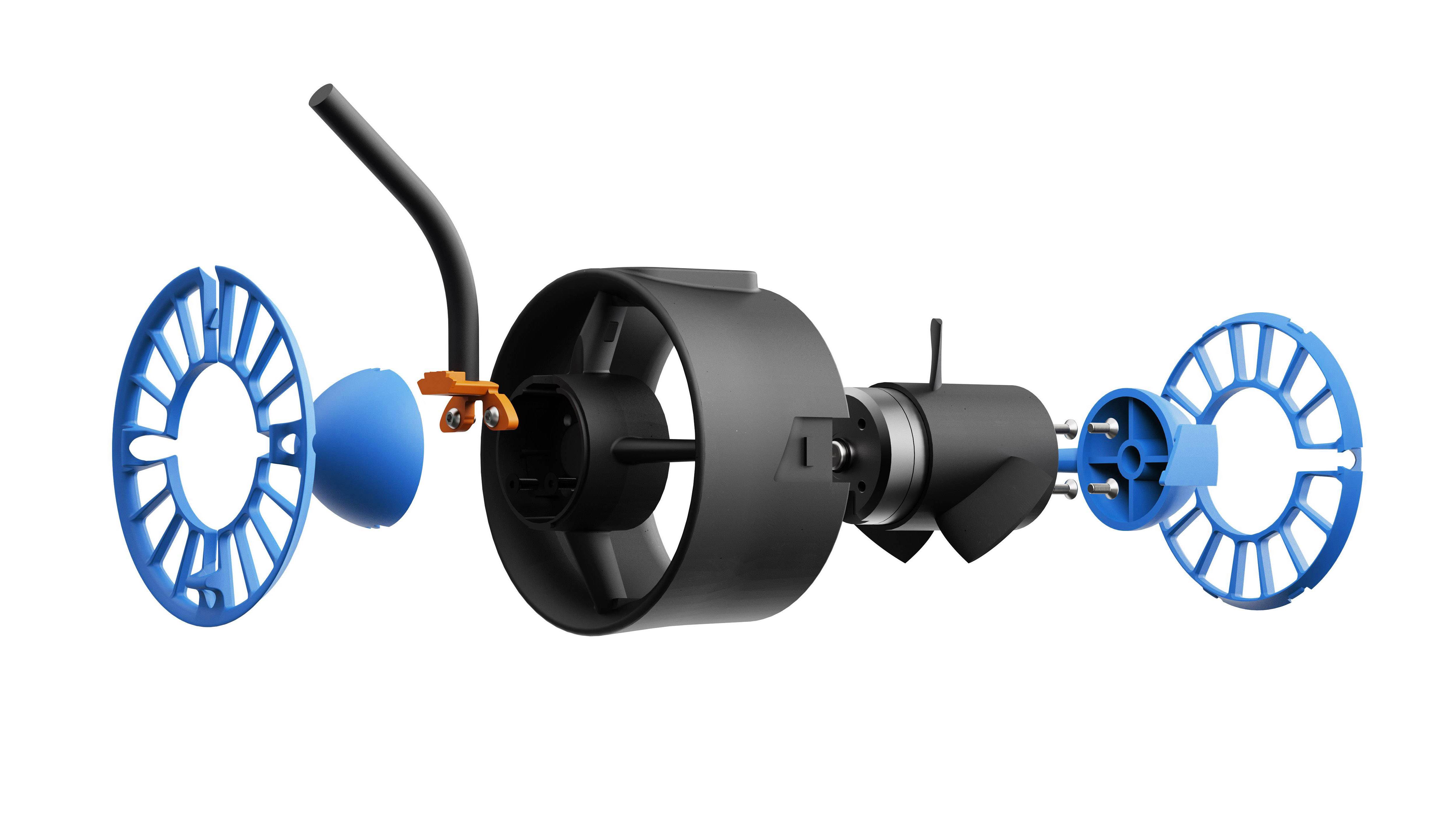 根据所选型号预装对应桨叶,另标配有反向桨叶,标配有阻拦水草等杂物的免工具拆装网罩,网罩符合 IP2 的手指阻挡防护等级。推进器超出 IP 防护标准等级,耐压能力达到水下 300 米深度。同样尾盖也可快速拆卸方便更换桨叶和清理异物。安装面除了涵道上的4个安装孔外,中心还有一个满足快速拆装的单安装孔。