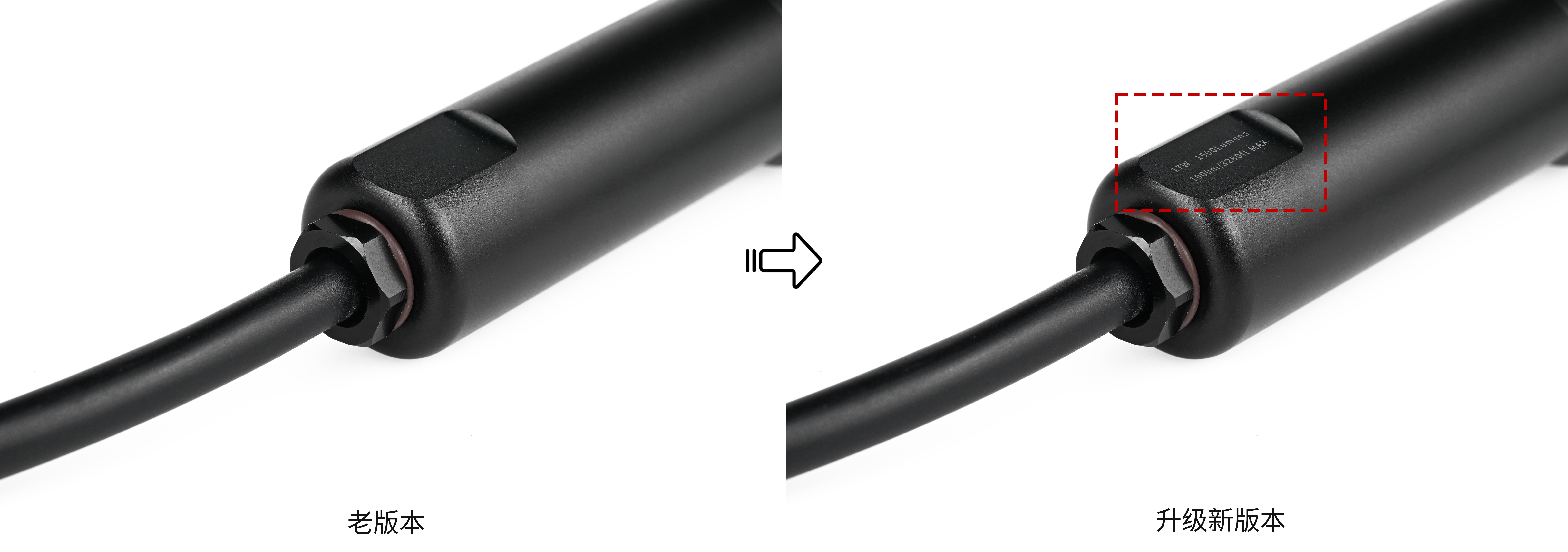 注意:本照明灯产品已升级为极限深度1000米,仅内部结构更新,外部尺寸及外观与老版本没有变化。新增了如图的激光打标字样以区分版本。